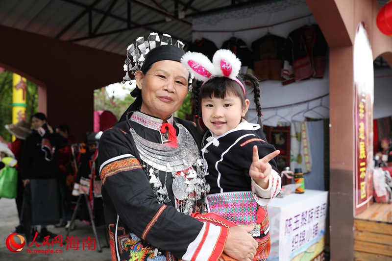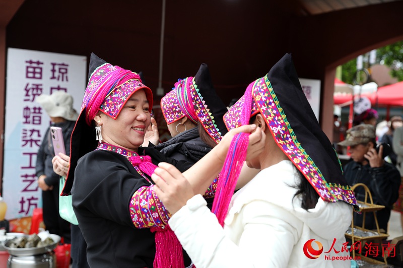 Tourists wear embroidered hats of the Miao ethnic group during a celebration of the Sanyuesan Festival, which falls on the third day of the third lunar month, in Qiongzhong city, south China's Hainan Province, March 30, 2025. (People's Daily Online/Fu Wuping)