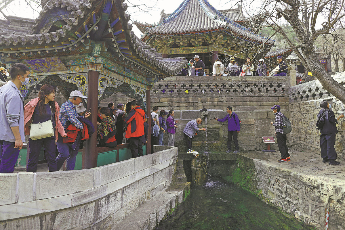Visitors line up and take turns to wash their hands in the water gushing out of one of the fountainheads of Nanlao Spring at Jinci Temple in Taiyuan, Shanxi province, on March 24. [Photo by Zhu Xingxin/China Daily]