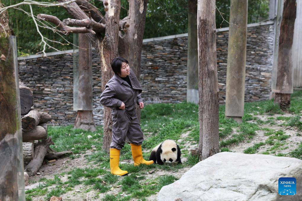 Giant panda keeper Li Rong calls panda cubs to drink milk at the Shenshuping giant panda base of Wolong National Nature Reserve in southwest China's Sichuan Province, March 27, 2025. (Xinhua/Xu Bingjie)