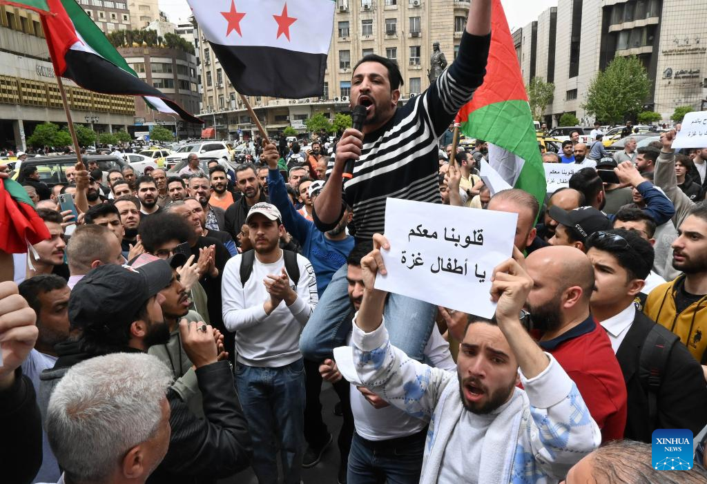 People take part in a protest against ongoing Israeli assaults on the Gaza Strip, in downtown Damascus, Syria, on April 7, 2025. (Photo by Ammar Safarjalani/Xinhua)