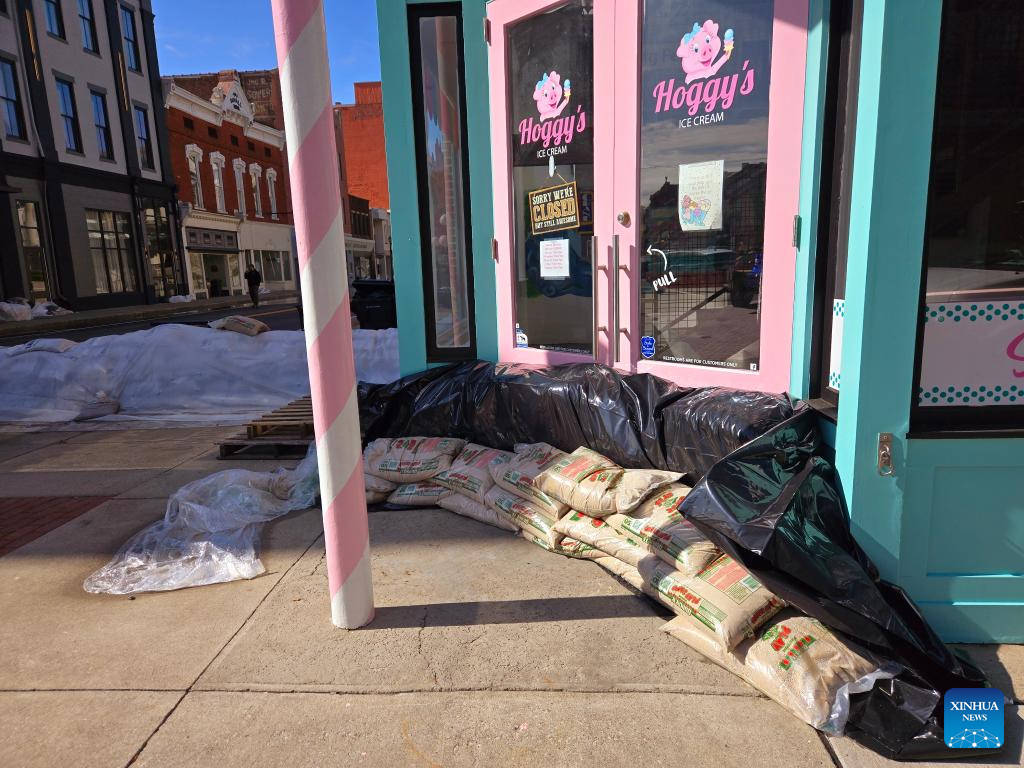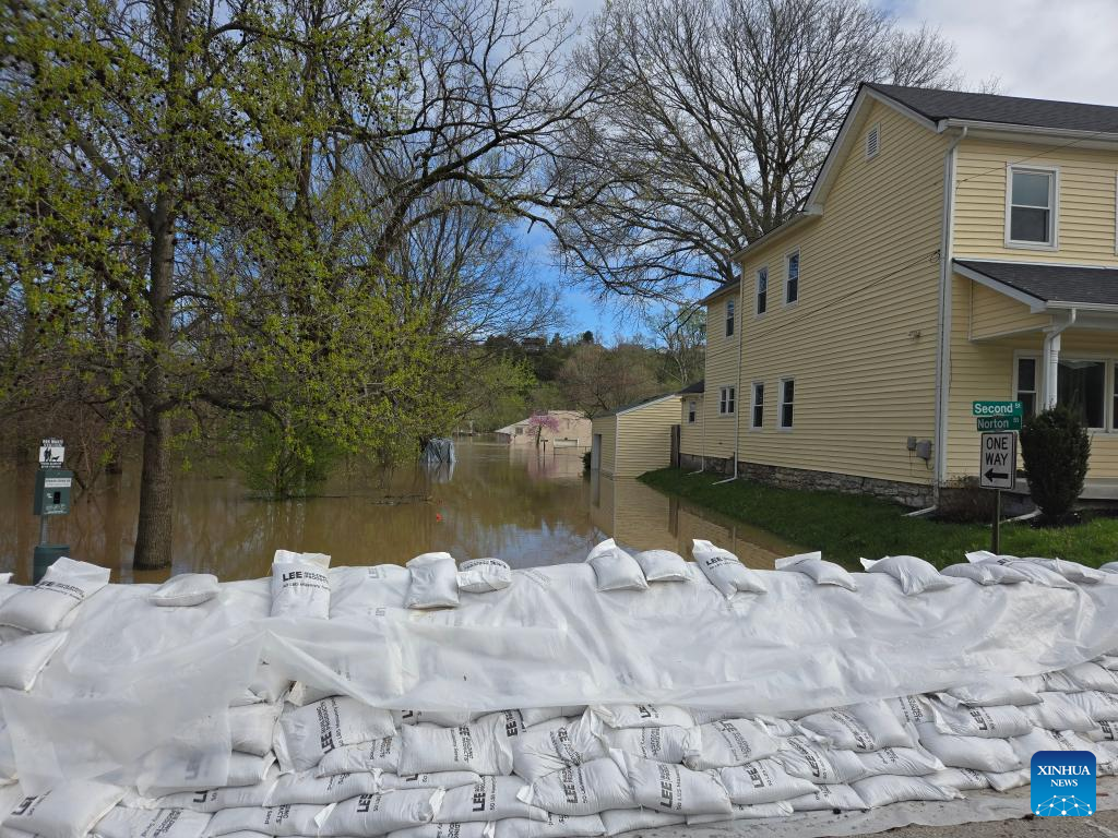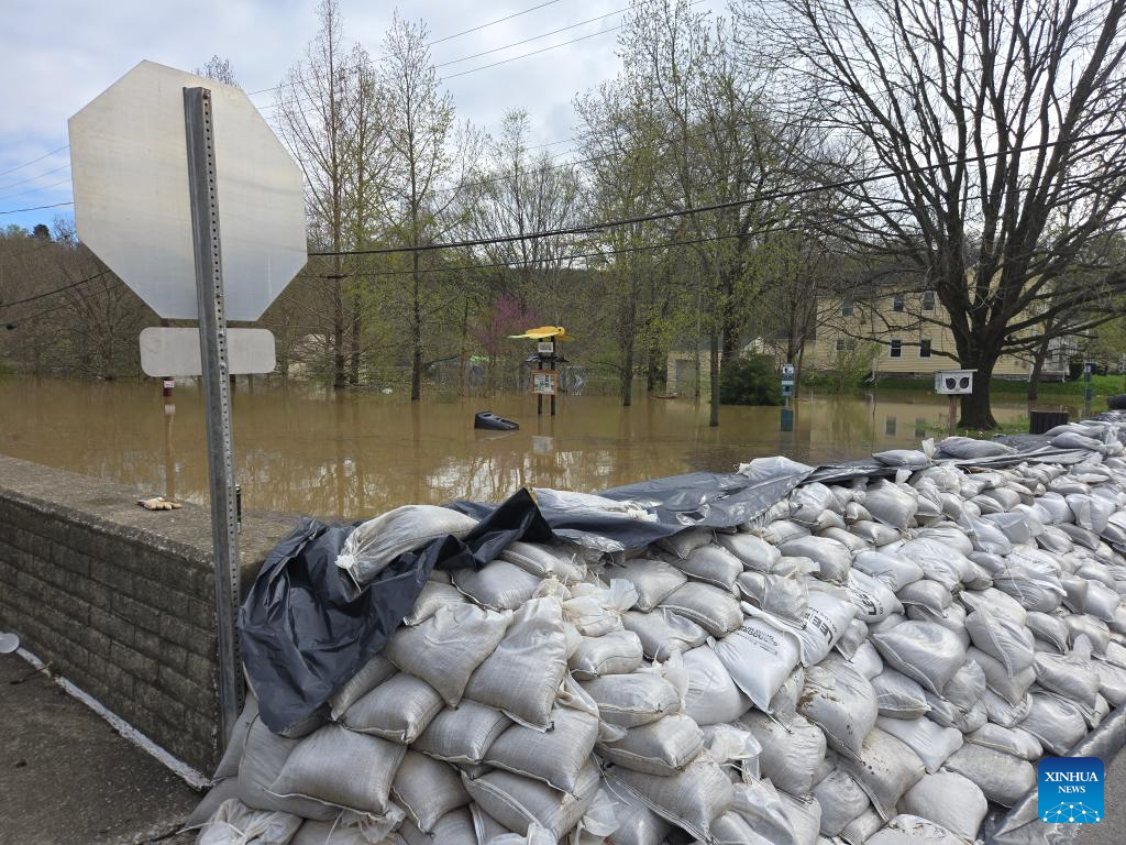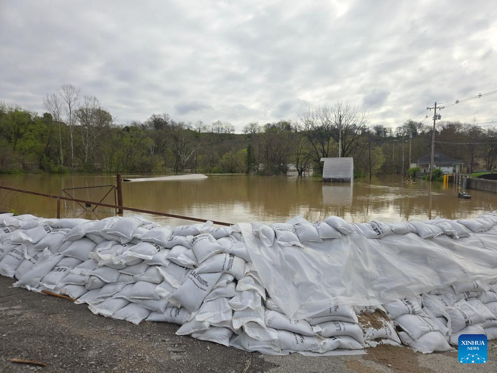 Photo taken on April 7, 2025 shows sandbags piled to prevent floods in Frankfort, Kentucky, the United States. (Photo by Wang Changzheng/Xinhua)