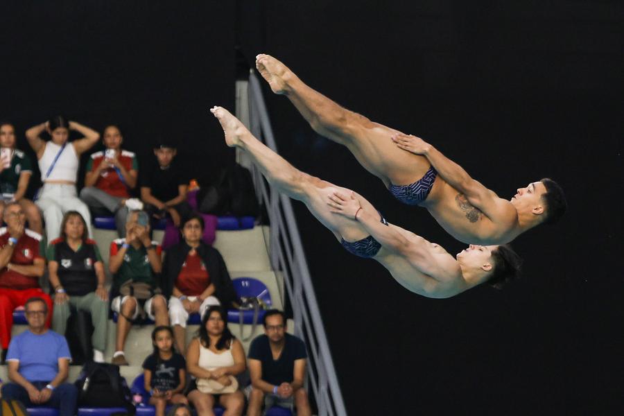 Juan Manuel Celaya Hernandez/Osmar Olvera Ibarra of Mexico compete during the men's Synchronized 3m springboard final on April 6, 2025. (Photo by Diana Marquez/Xinhua)