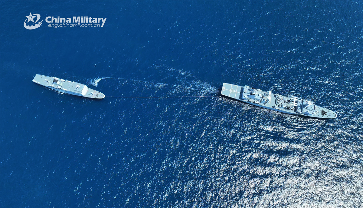Comprehensive supply ship Weishanhu (Hull 887) and troopship Nanyun 830, attached to a naval service group under the Chinese PLA Southern Theater Command, conduct astern replenishment-at-sea during a recent maritime maneuver and replenishment training exercise in the South China Sea. (eng.chinamil.com.cn/Photo by Wu Huanqing)