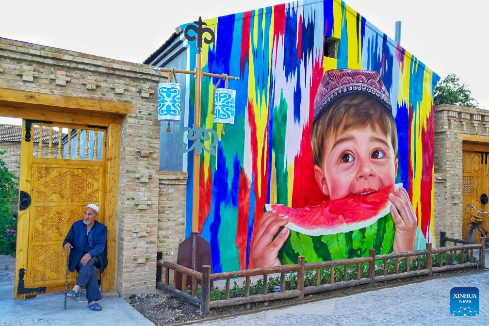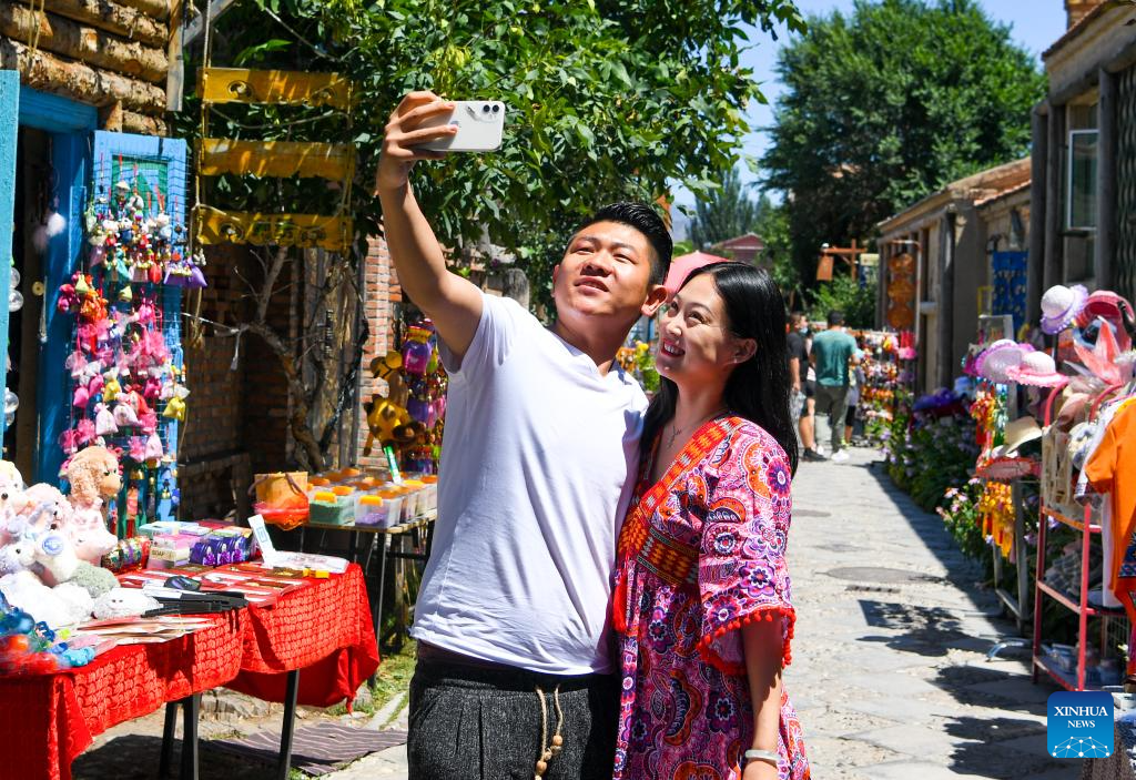 Tourists take selfies on one of the eight main streets in Tekes County in Ili Kazak Autonomous Prefecture, northwest China's Xinjiang Uygur Autonomous Region, July 23, 2021.