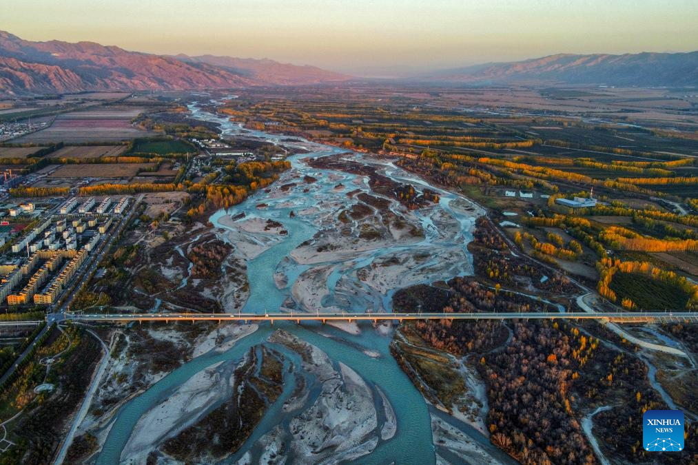 An aerial photo taken on Oct. 9, 2024 shows a view of the Tekes River in Tekes County, Ili Kazak Autonomous Prefecture, northwest China's Xinjiang Uygur Autonomous Region.