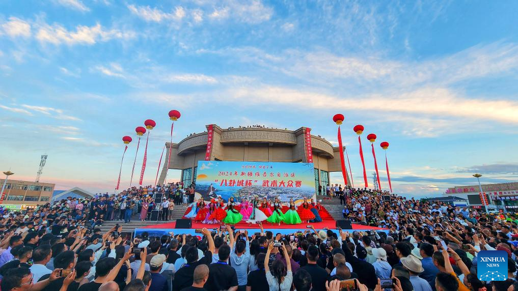 People watch artistic performances at the opening of a martial arts competition in Tekes County, Ili Kazak Autonomous Prefecture, northwest China's Xinjiang Uygur Autonomous Region, July 25, 2024.