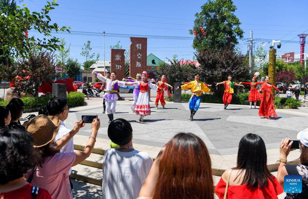 Tourists enjoy artistic performances in Tekes County, Ili Kazak Autonomous Prefecture, northwest China's Xinjiang Uygur Autonomous Region, July 23, 2021.
