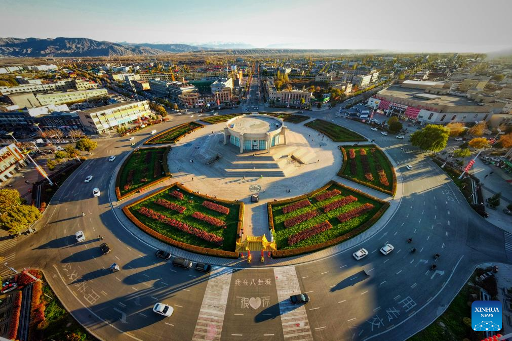 An aerial photo taken on Nov. 4, 2023 shows the central Tai Chi Plaza of Tekes County in Ili Kazak Autonomous Prefecture, northwest China's Xinjiang Uygur Autonomous Region.