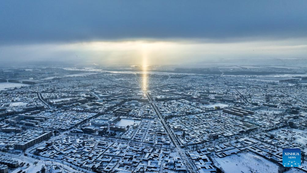 An aerial photo taken on Feb. 22, 2025 shows the central Tai Chi Plaza of Tekes County in Ili Kazak Autonomous Prefecture, northwest China's Xinjiang Uygur Autonomous Region.