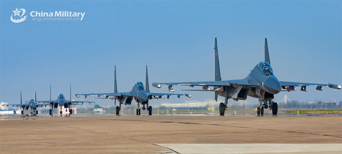 Su-30 fighter jets attached to an aviation brigade of the Chinese PLA Air Force taxi in formation on the runway during a flight training exercise on March 26, 2025. (eng.chinamil.com.cn/Huang Guotai)