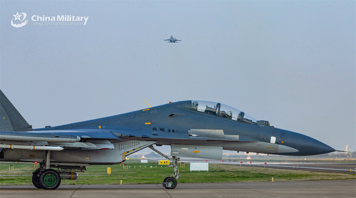 A Su-30 fighter jet attached to an aviation brigade of the Chinese PLA Air Force takes off in speed during a flight training exercise on March 26, 2025. (eng.chinamil.com.cn/Huang Guotai)
