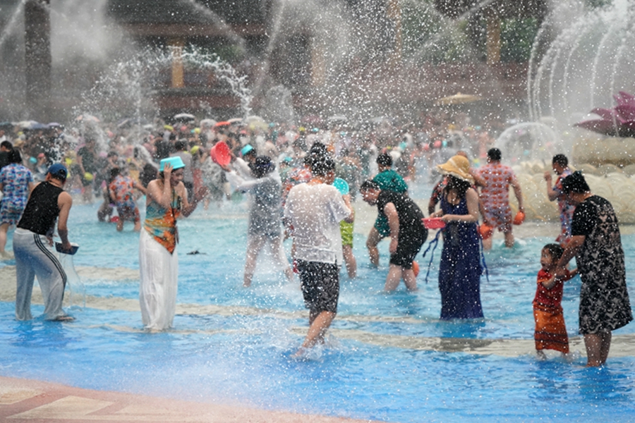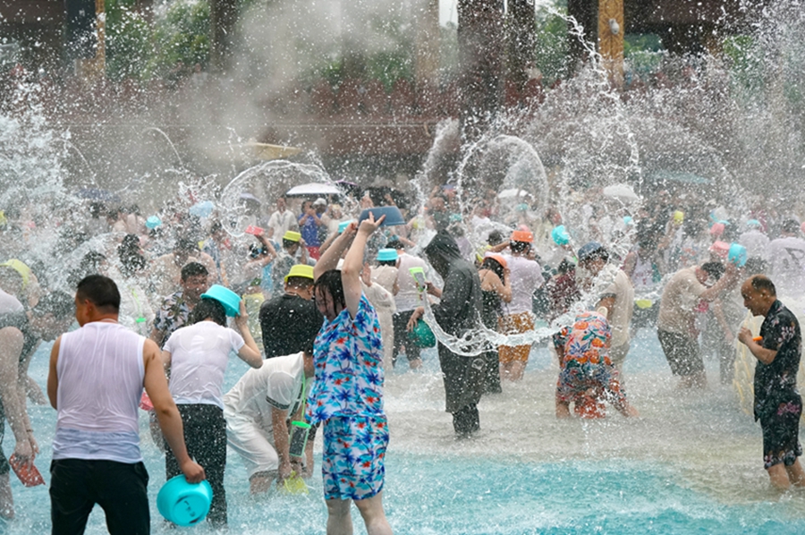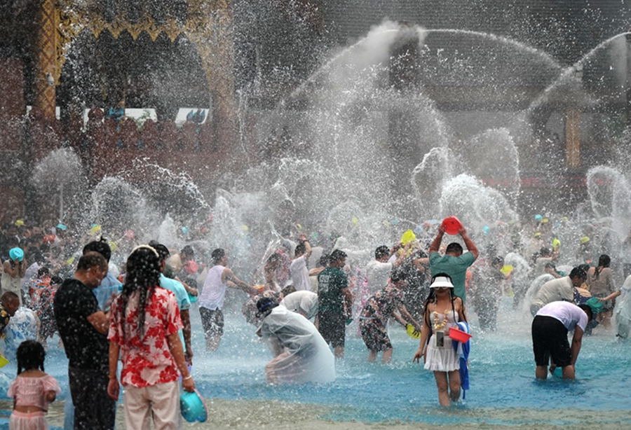 Tourists splash water on one another at a cultural park in Xishuangbanna Dai Autonomous Prefecture, southwest China's Yunnan Province, on April 7, 2025. (vip.people.com/Zhou Guoqiang)