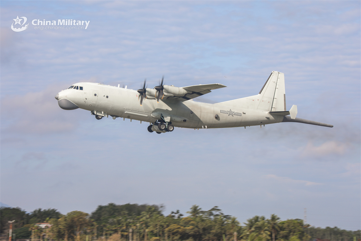 Y-8 anti-submarine patrol aircraft attached to a regiment with the Chinese PLA Navy takes off during a multi-subject flight training exercise on March 24, 2025. (eng.chinamil.com.cn/Photo by Qin Qianjiang)