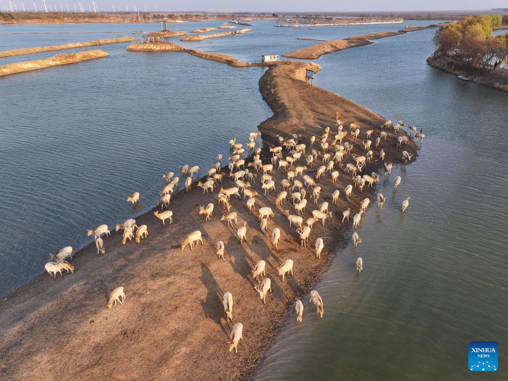 An aerial drone photo shows milu deer in Yancheng, east China's Jiangsu Province, Dec. 21, 2024. Yancheng, located in the middle part of the coastline of Jiangsu Province, is named after the meaning of "city surrounded by salt fields". In recent years, Yancheng has strived to shape a green and livable city through various efforts. (Xinhua/Ji Chunpeng)