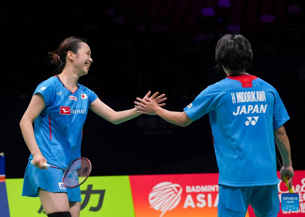 Midorikawa Hiroki/Saito Natsu (L) of Japan celebrate victory after the mixed doubles quarterfinal match against Feng Yanzhe/Huang Dongping of China at Badminton Asia Championships 2025 in Ningbo, east China's Zhejiang Province, April 11, 2025. (Xinhua/Sun Fei)