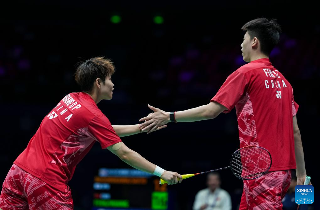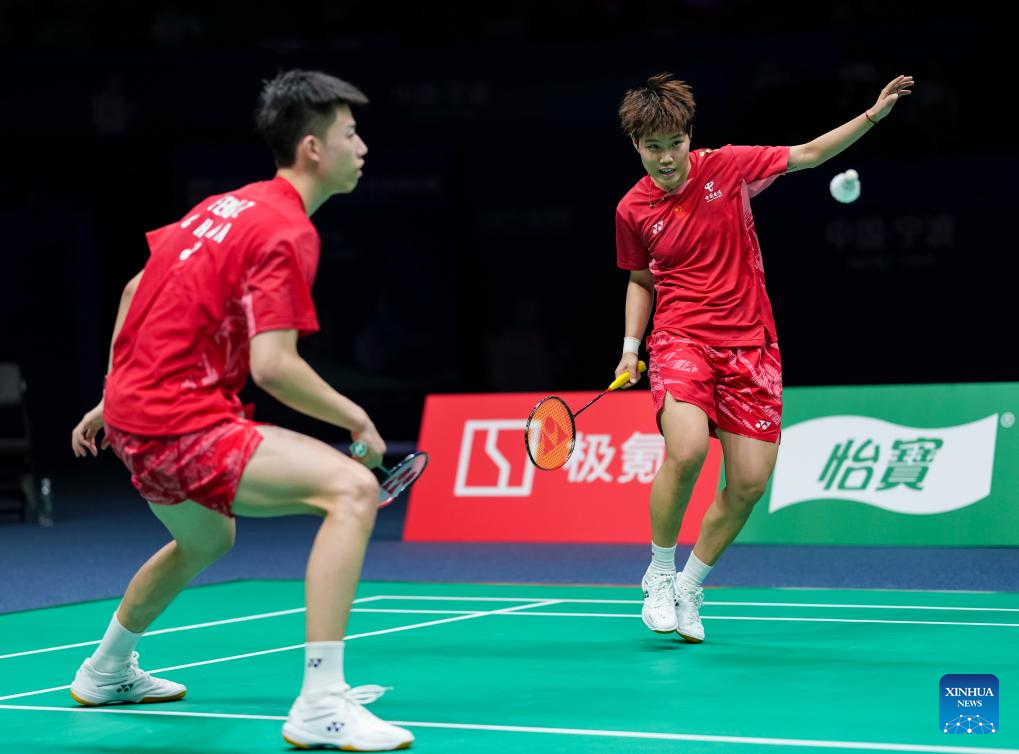 Feng Yanzhe/Huang Dongping (R) of China compete during the mixed doubles quarterfinal match against Midorikawa Hiroki/Saito Natsu of Japan at Badminton Asia Championships 2025 in Ningbo, east China's Zhejiang Province, April 11, 2025. (Xinhua/Sun Fei)