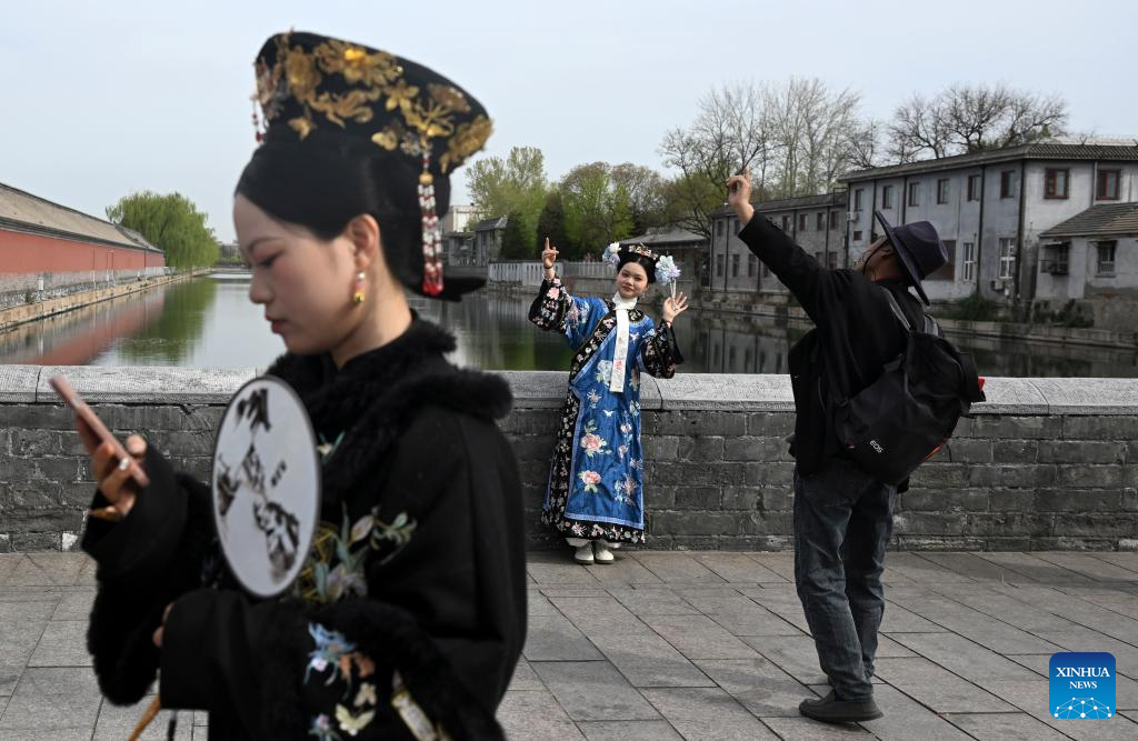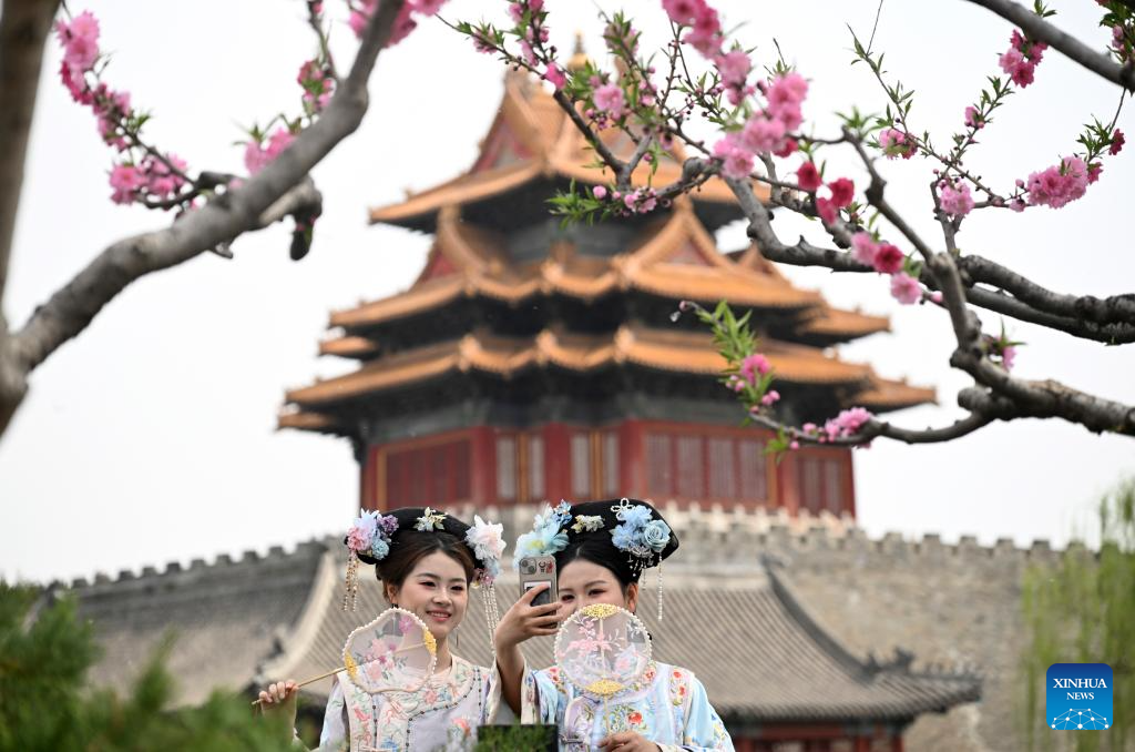 Visitors in traditional costumes take selfies near a turret of the Forbidden City in Beijing, capital of China, April 8, 2025.