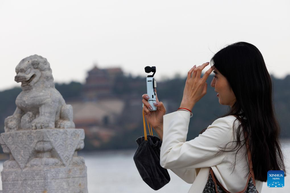 A visitor shoots videos at the 17-Arch Bridge in the Summer Palace in Beijing, capital of China, April 9, 2025.