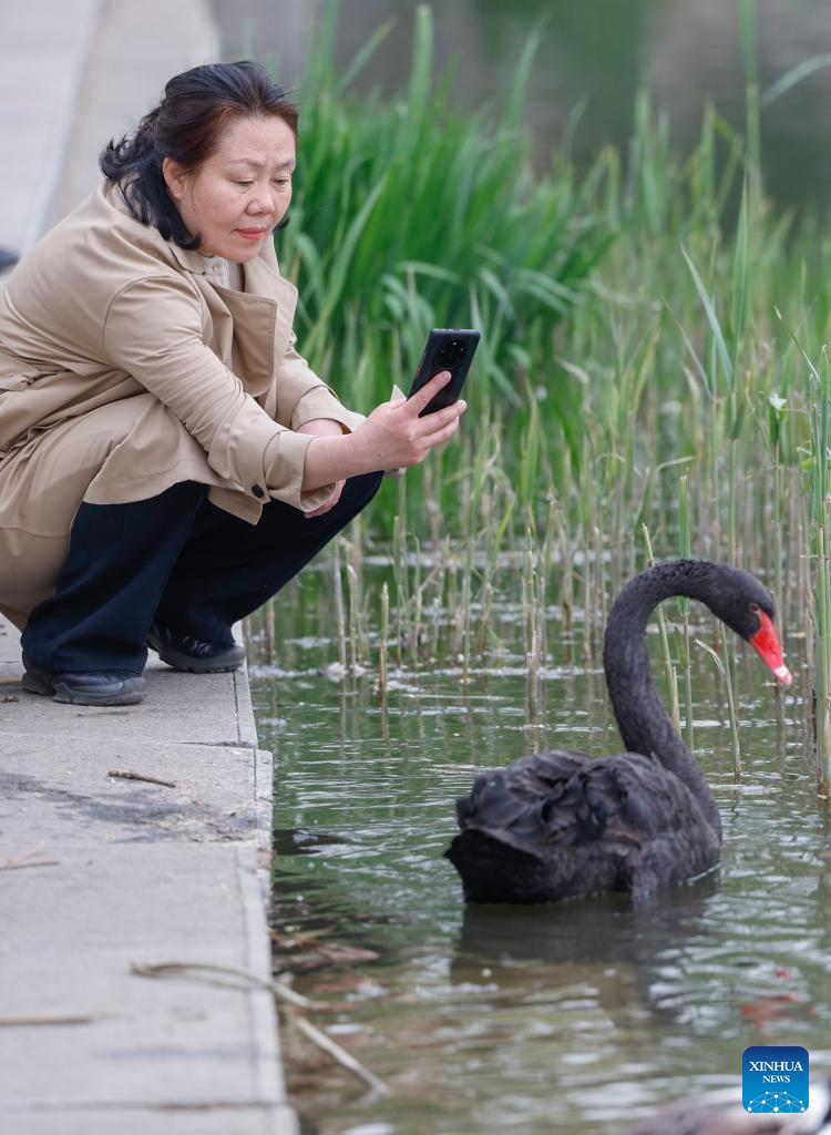 A visitor takes photos of a wild black swan at Yuyuantan Park in Beijing, capital of China, April 8, 2025.