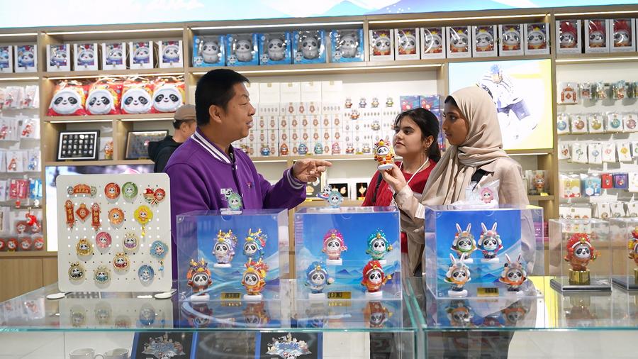 UAE student Bashayer Omar purchases souvenirs at the gift shop of Beijing Olympic Museum, in Beijing, capital of China, on April 6, 2025. (Xinhua/ Hu Zhenze)