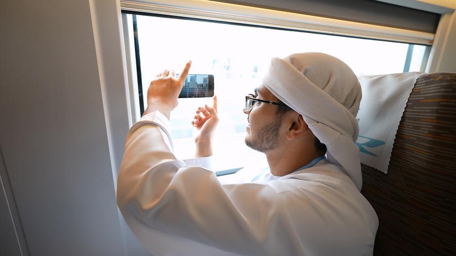 A UAE student takes photo of the scenery outside the window with a mobile phone on a high-speed train from Beijing to Tianjin Railway Station, on April 7, 2025. (Xinhua/Hu Zhenze)