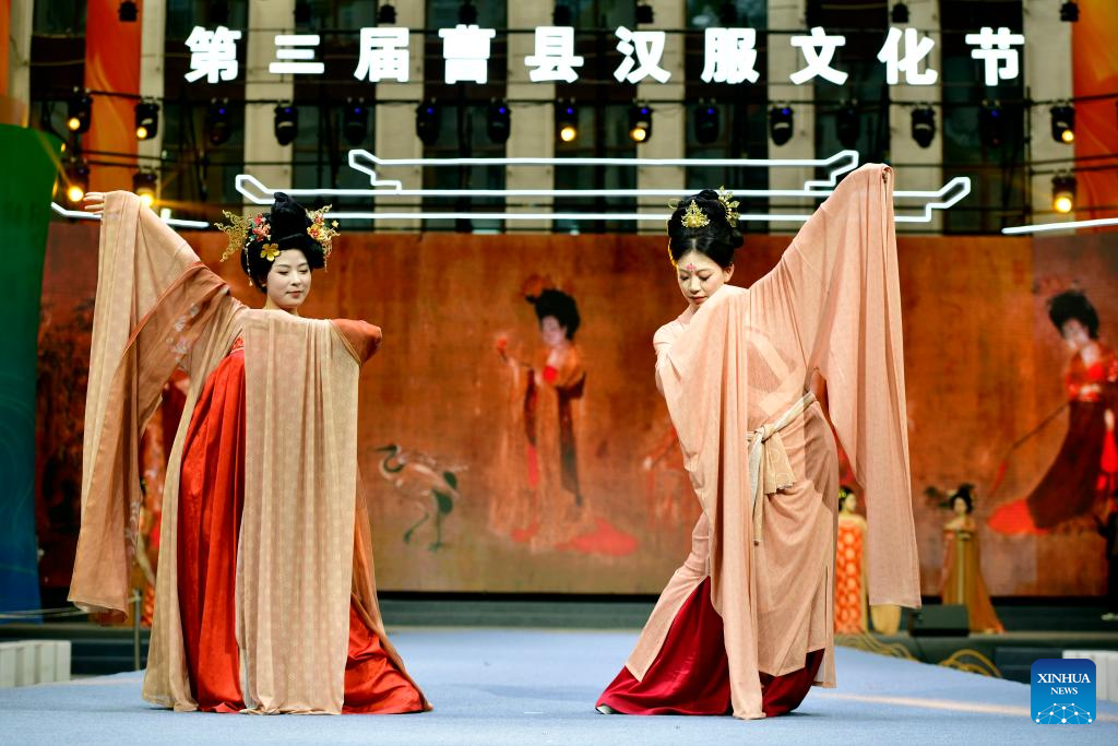 Models present Hanfu on the stage during a Hanfu launch event in Caoxian County, east China's Shandong Province, April 10, 2025. (Xinhua/Guo Xulei)