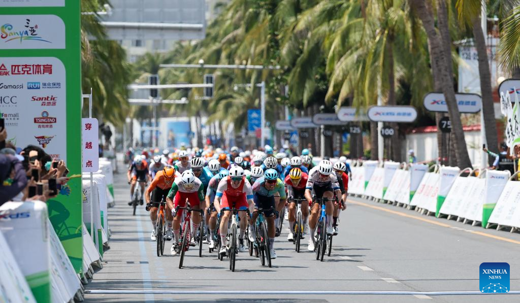 Cyclists sprint during Stage 5 at the 16th Tour of Hainan cycling race from Dongfang to Sanya, south China's Hainan Province, April 11, 2025. (Xinhua/Yang Guanyu)