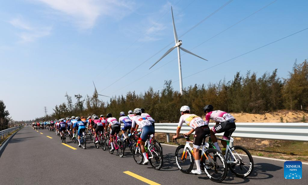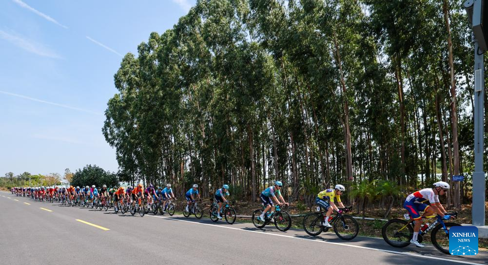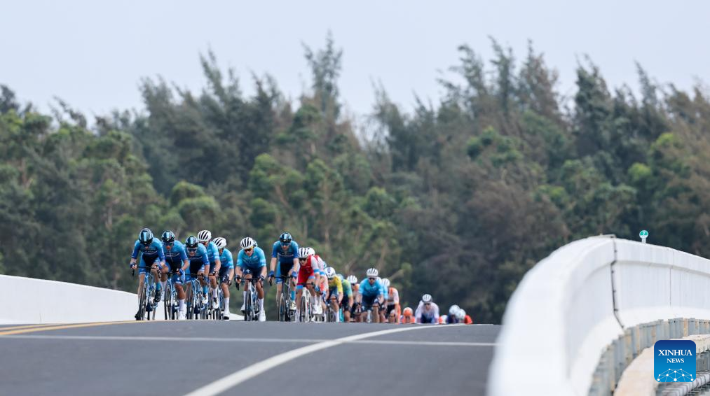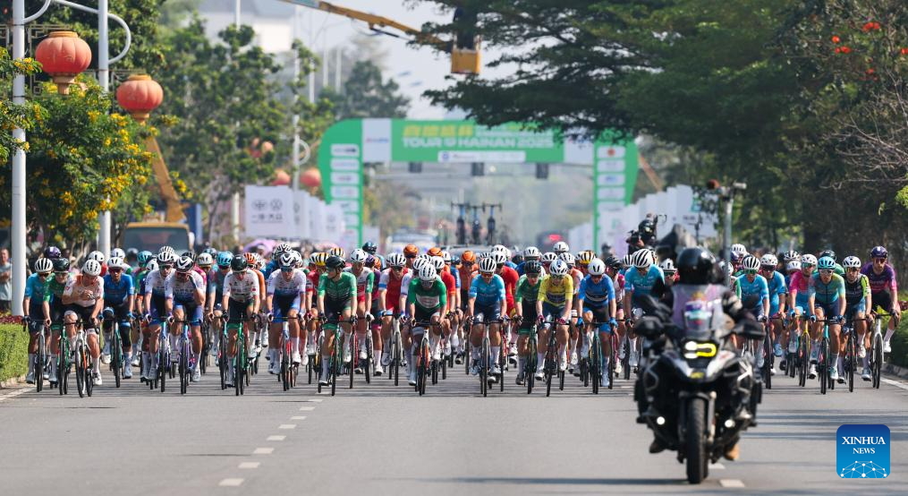 Cyclists compete during Stage 5 at the 16th Tour of Hainan cycling race from Dongfang to Sanya, south China's Hainan Province, April 11, 2025. (Xinhua/Yang Guanyu)