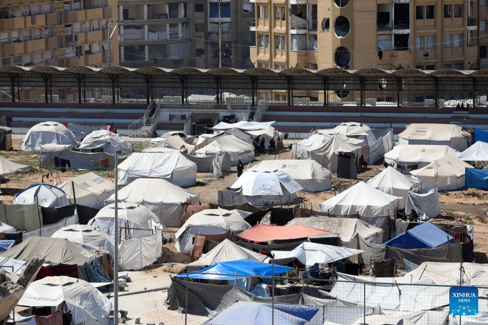 Tents are seen at the Islamic University of Gaza, which was damaged by Israeli bombardment, in Gaza City, April 11, 2025. The Islamic University of Gaza, one of the largest universities in the Gaza Strip, now has turned into a shelter for hundreds of Palestinian families. (Photo by Rizek Abdeljawad/Xinhua)