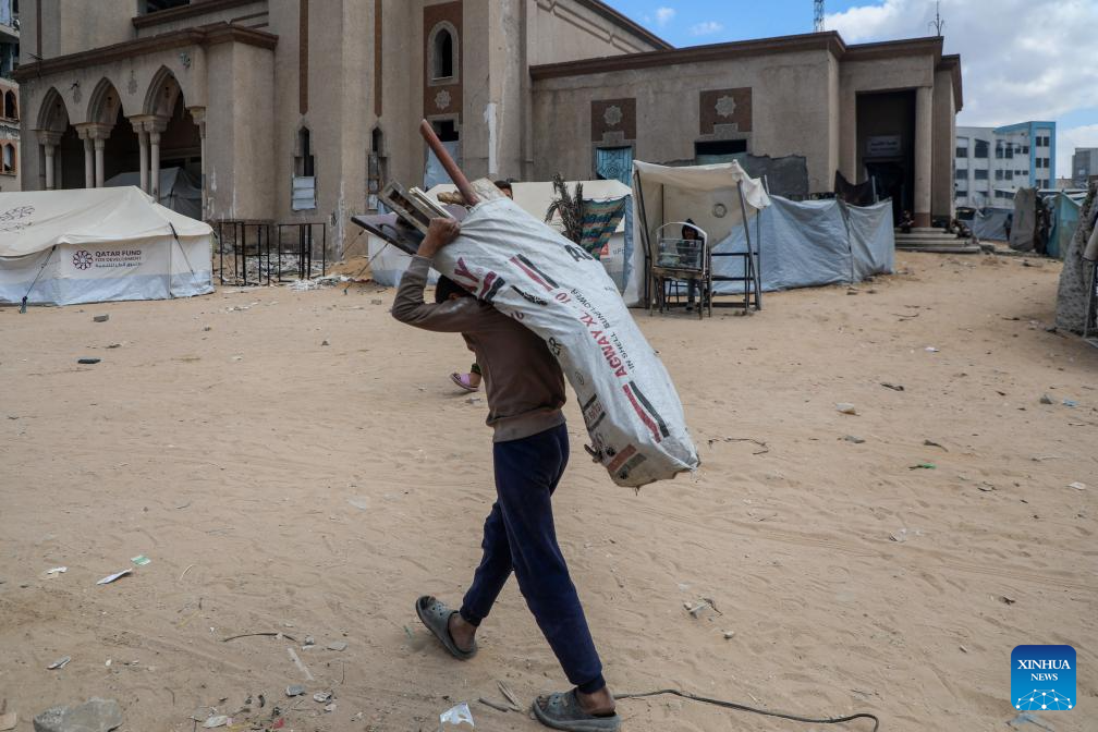 A displaced Palestinian carries materials at the Islamic University of Gaza, which was damaged by Israeli bombardment, in Gaza City, April 11, 2025. The Islamic University of Gaza, one of the largest universities in the Gaza Strip, now has turned into a shelter for hundreds of Palestinian families. (Photo by Rizek Abdeljawad/Xinhua)