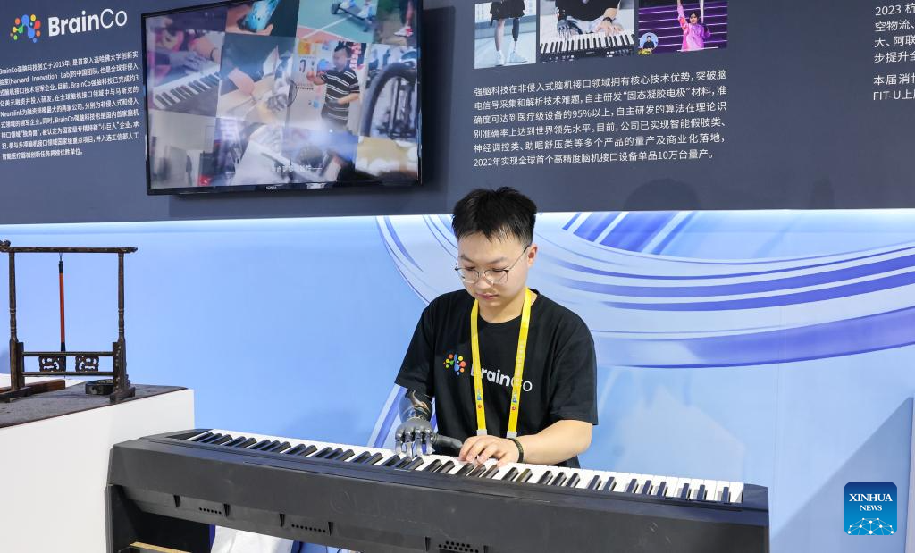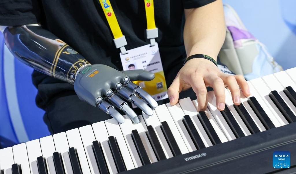An exhibitor plays piano with a smart prosthetic hand at the 5th China International Consumer Products Expo (CICPE) in Haikou, south China's Hainan Province, April 13, 2025. The 5th CICPE runs from April 13 to 18 in south China's island province of Hainan.
