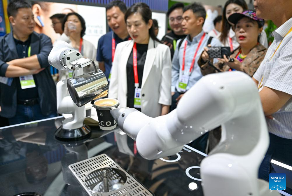 Visitors watch a robot making coffee at the 5th China International Consumer Products Expo (CICPE) in Haikou, south China's Hainan Province, April 13, 2025. The 5th CICPE runs from April 13 to 18 in south China's island province of Hainan.