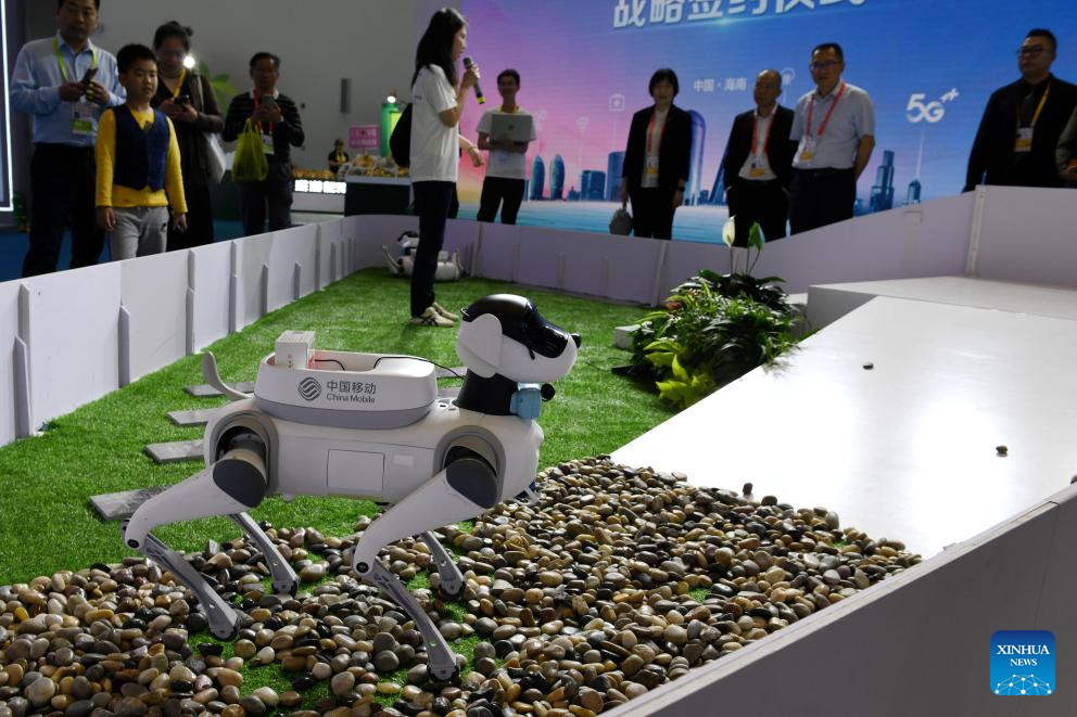 A robot dog is pictured at the booth of China Mobile at the 5th China International Consumer Products Expo (CICPE) in Haikou, south China's Hainan Province, April 13, 2025. The 5th CICPE runs from April 13 to 18 in south China's island province of Hainan.