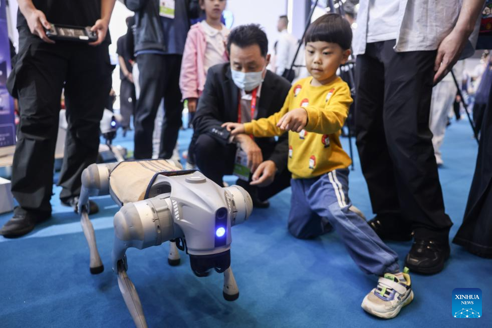 A boy interacts with a robot dog displayed by Unitree Robotics at the 5th China International Consumer Products Expo (CICPE) in Haikou, south China's Hainan Province, April 13, 2025. The 5th CICPE runs from April 13 to 18 in south China's island province of Hainan.