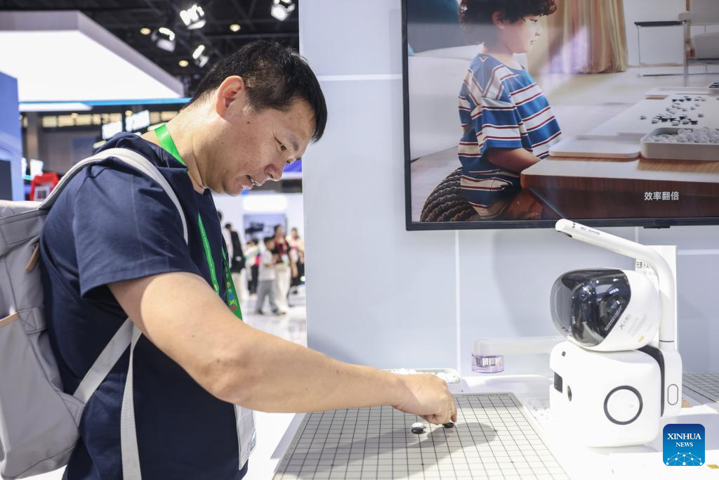 A visitor experiences SenseTime's AI Go robot at the 5th China International Consumer Products Expo (CICPE) in Haikou, south China's Hainan Province, April 13, 2025. The 5th CICPE runs from April 13 to 18 in south China's island province of Hainan.