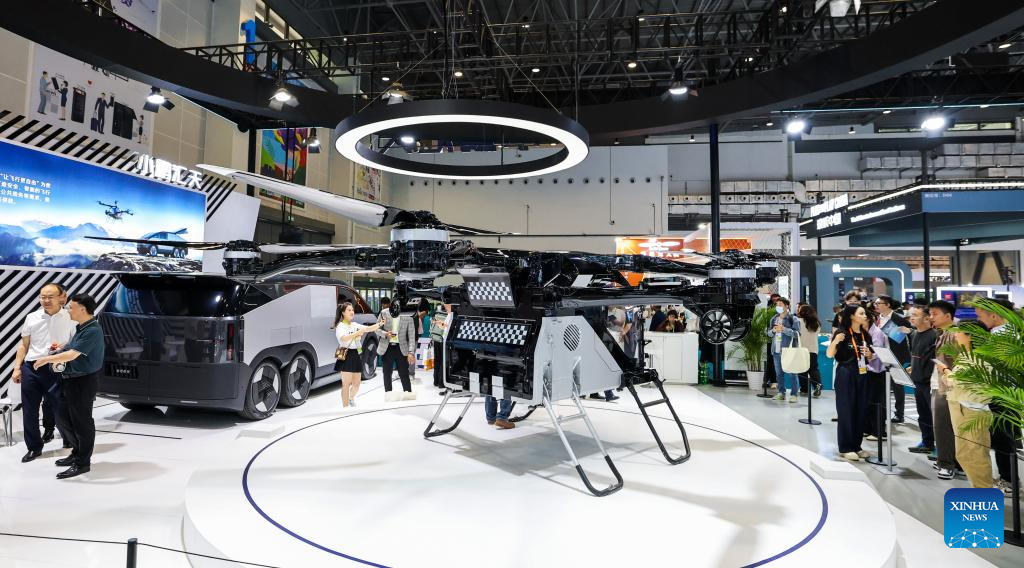 Visitors look at a flying car by Xpeng AeroHT at the 5th China International Consumer Products Expo (CICPE) in Haikou, south China's Hainan Province, April 13, 2025. The 5th CICPE runs from April 13 to 18 in south China's island province of Hainan.