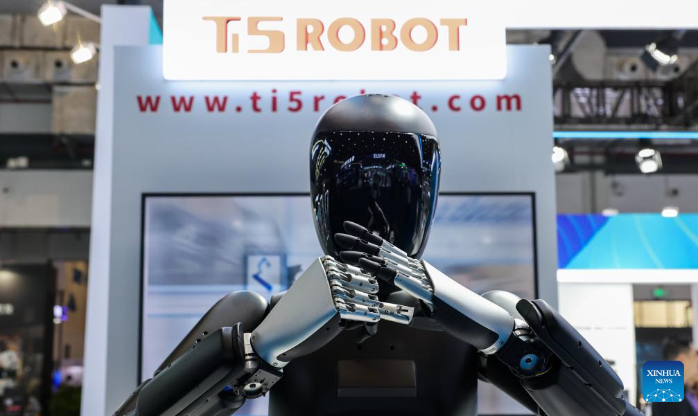 A robot is on display at the 5th China International Consumer Products Expo (CICPE) in Haikou, south China's Hainan Province, April 13, 2025. The 5th CICPE runs from April 13 to 18 in south China's island province of Hainan.