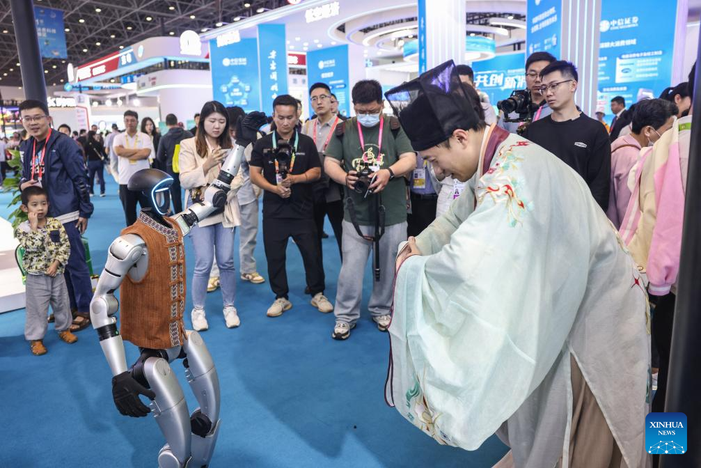 A visitor dressed in ancient costume interacts with a humanoid robot of Unitree Robotics at the 5th China International Consumer Products Expo (CICPE) in Haikou, south China's Hainan Province, April 13, 2025. The 5th CICPE runs from April 13 to 18 in south China's island province of Hainan.