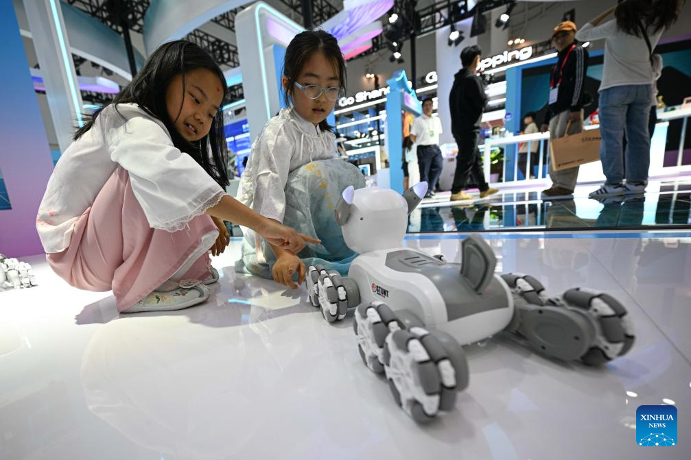 Children play with a robot dog toy at the 5th China International Consumer Products Expo (CICPE) in Haikou, south China's Hainan Province, April 13, 2025. The 5th CICPE runs from April 13 to 18 in south China's island province of Hainan.