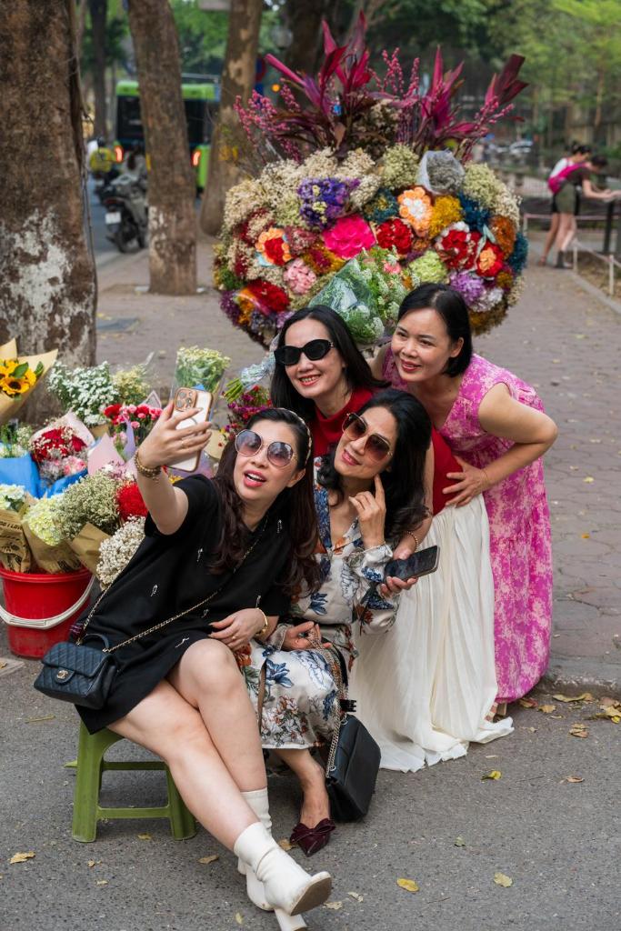 People take photos with a flowers stall in Hanoi, Vietnam, March 25, 2025. (Xinhua/Zhu Wei)