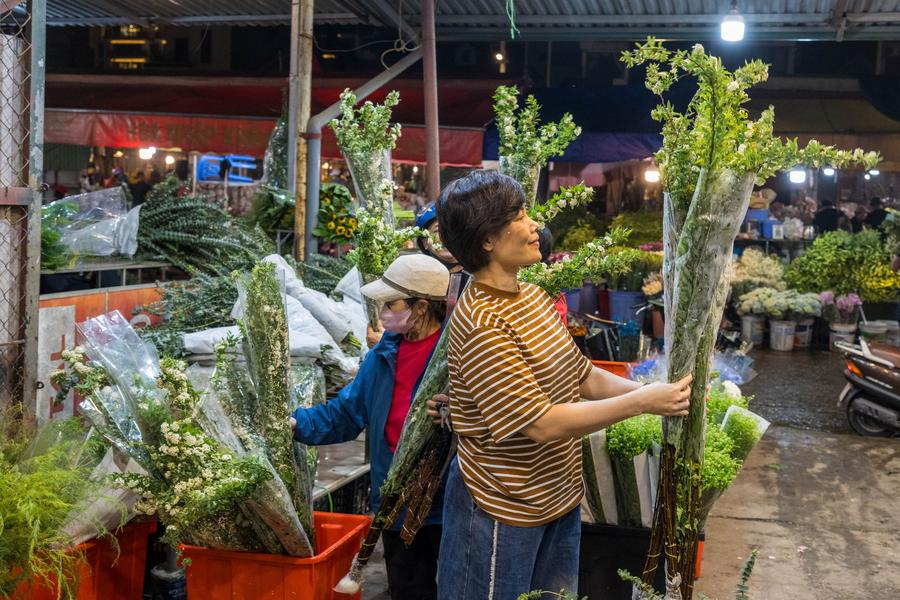 A vendor arranges flowers from China's Yunnan Province at Quang Ba Flower Market in Hanoi, Vietnam, March 28, 2025. (Xinhua/Zhu Wei)
