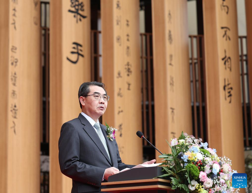 Chinese Ambassador to Japan Wu Jianghao addresses the opening ceremony of the China Pavilion at the Osaka Expo in Osaka, Japan, April 13, 2025. The China Pavilion officially opened on Sunday at the Osaka Expo, with an opening ceremony held in front of the pavilion's main building, which is designed to resemble a traditional Chinese scroll. Inspired by traditional Chinese calligraphy scrolls, the pavilion's architectural design embodies the theme of "Building a Community of Life for Man and Nature -- Future Society of Green Development." Osaka Expo 2025 will run from April 13 to October 13, 2025. The China Pavilion, one of the largest foreign self-built pavilions at the event, covers approximately 3,500 square meters. (Xinhua/Jia Haocheng)