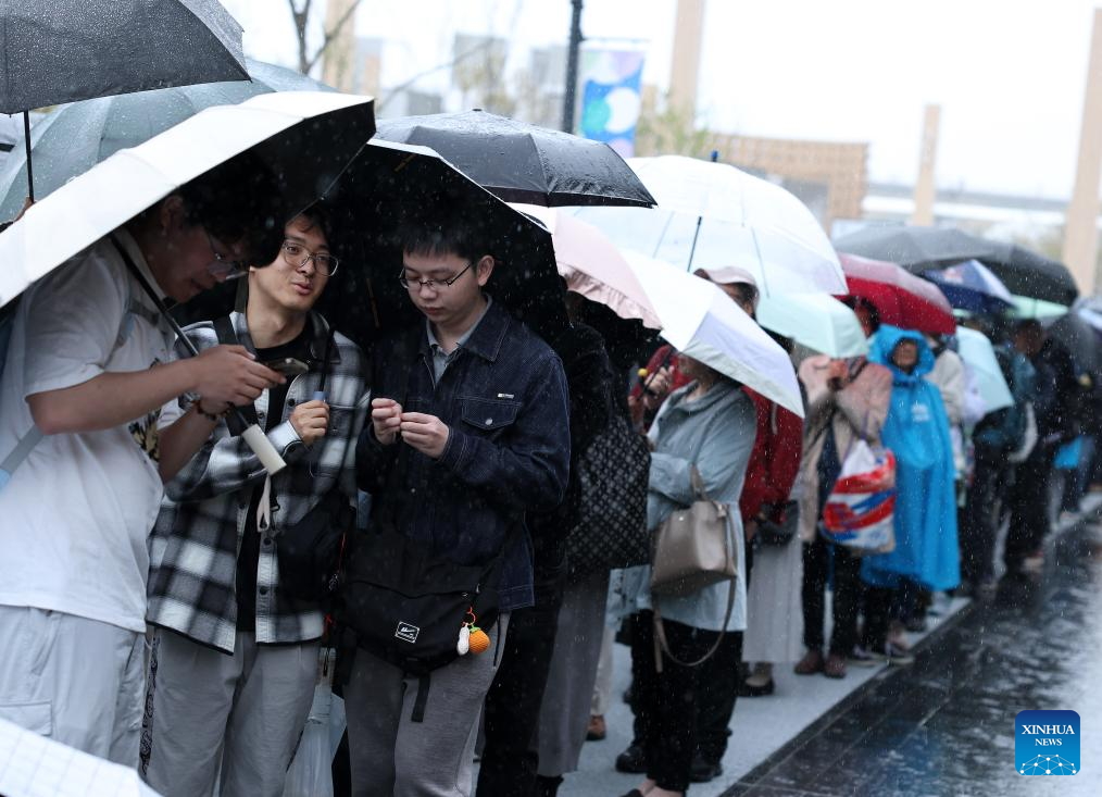 Visitors line up to enter the China Pavilion at the Osaka Expo in Osaka, Japan, April 13, 2025. The China Pavilion officially opened on Sunday at the Osaka Expo, with an opening ceremony held in front of the pavilion's main building, which is designed to resemble a traditional Chinese scroll. Inspired by traditional Chinese calligraphy scrolls, the pavilion's architectural design embodies the theme of "Building a Community of Life for Man and Nature -- Future Society of Green Development." Osaka Expo 2025 will run from April 13 to October 13, 2025. The China Pavilion, one of the largest foreign self-built pavilions at the event, covers approximately 3,500 square meters. (Xinhua/Jia Haocheng)