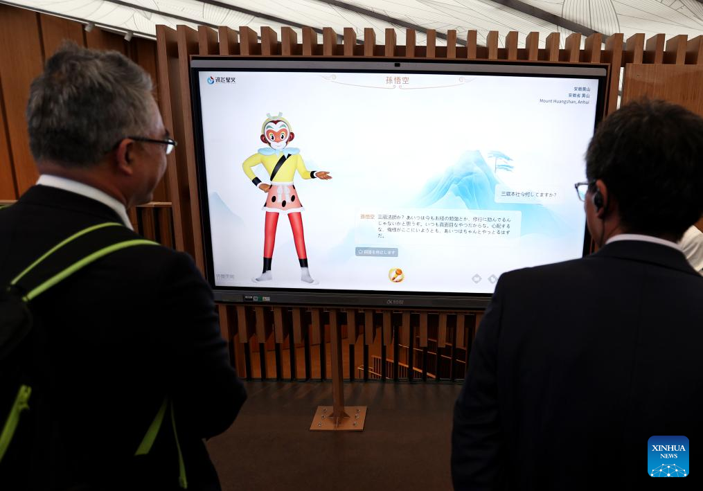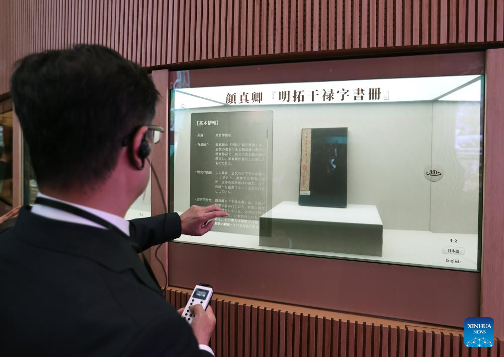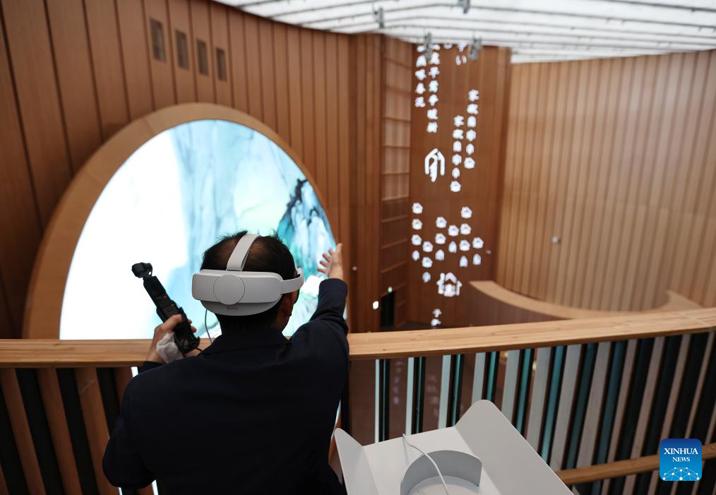 A visitor tours the China Pavilion using a mixed reality (MR) device at the Osaka Expo in Osaka, Japan, April 13, 2025. The China Pavilion officially opened on Sunday at the Osaka Expo, with an opening ceremony held in front of the pavilion's main building, which is designed to resemble a traditional Chinese scroll. Inspired by traditional Chinese calligraphy scrolls, the pavilion's architectural design embodies the theme of "Building a Community of Life for Man and Nature -- Future Society of Green Development." Osaka Expo 2025 will run from April 13 to October 13, 2025. The China Pavilion, one of the largest foreign self-built pavilions at the event, covers approximately 3,500 square meters. (Xinhua/Jia Haocheng)