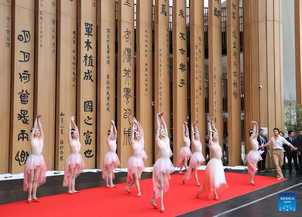 Actors perform during the opening ceremony of the China Pavilion at the Osaka Expo in Osaka, Japan, April 13, 2025. The China Pavilion officially opened on Sunday at the Osaka Expo, with an opening ceremony held in front of the pavilion's main building, which is designed to resemble a traditional Chinese scroll. Inspired by traditional Chinese calligraphy scrolls, the pavilion's architectural design embodies the theme of "Building a Community of Life for Man and Nature -- Future Society of Green Development." Osaka Expo 2025 will run from April 13 to October 13, 2025. The China Pavilion, one of the largest foreign self-built pavilions at the event, covers approximately 3,500 square meters. (Xinhua/Jia Haocheng)