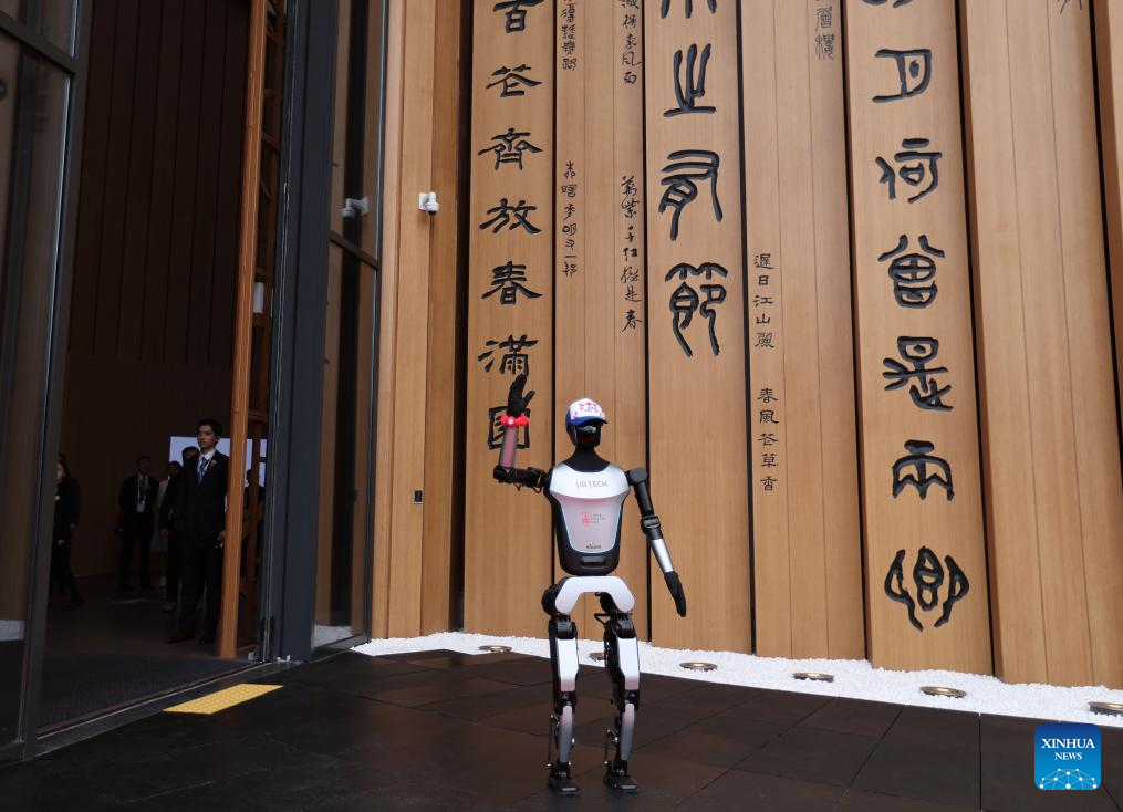 A robot greets guests outside the China Pavilion at the Osaka Expo in Osaka, Japan, April 13, 2025. The China Pavilion officially opened on Sunday at the Osaka Expo, with an opening ceremony held in front of the pavilion's main building, which is designed to resemble a traditional Chinese scroll. Inspired by traditional Chinese calligraphy scrolls, the pavilion's architectural design embodies the theme of "Building a Community of Life for Man and Nature -- Future Society of Green Development." Osaka Expo 2025 will run from April 13 to October 13, 2025. The China Pavilion, one of the largest foreign self-built pavilions at the event, covers approximately 3,500 square meters. (Xinhua/Jia Haocheng)
