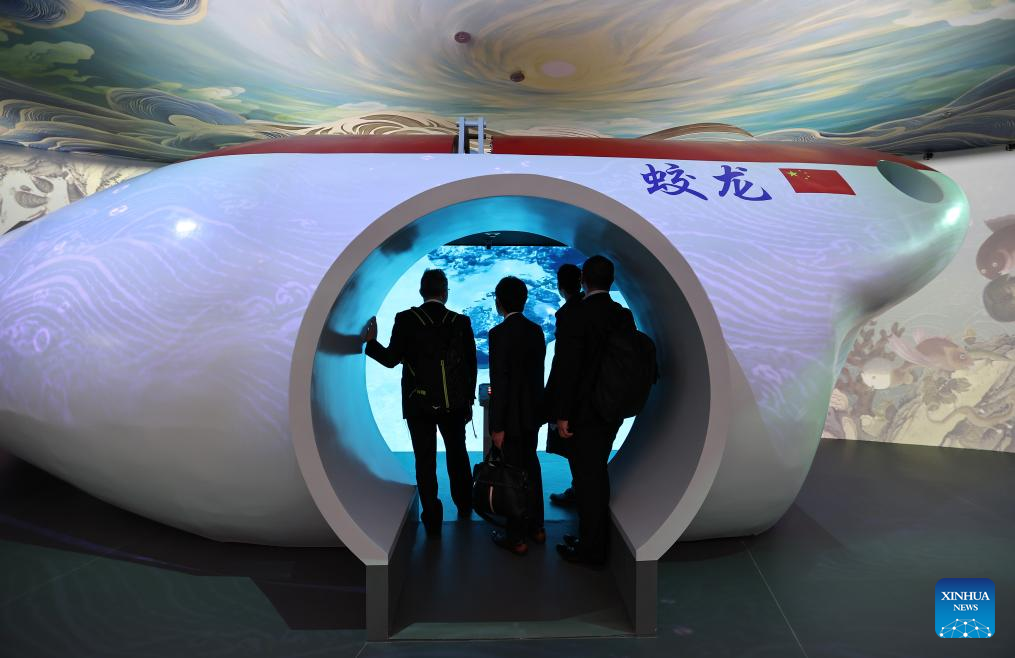 People visit the "Jiaolong" deep-sea submersible experience capsule in the China Pavilion at the Osaka Expo in Osaka, Japan, April 13, 2025. The China Pavilion officially opened on Sunday at the Osaka Expo, with an opening ceremony held in front of the pavilion's main building, which is designed to resemble a traditional Chinese scroll. Inspired by traditional Chinese calligraphy scrolls, the pavilion's architectural design embodies the theme of "Building a Community of Life for Man and Nature -- Future Society of Green Development." Osaka Expo 2025 will run from April 13 to October 13, 2025. The China Pavilion, one of the largest foreign self-built pavilions at the event, covers approximately 3,500 square meters. (Xinhua/Jia Haocheng)