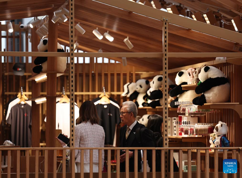 People visit a souvenir shop of the China Pavilion at the Osaka Expo in Osaka, Japan, April 13, 2025. The China Pavilion officially opened on Sunday at the Osaka Expo, with an opening ceremony held in front of the pavilion's main building, which is designed to resemble a traditional Chinese scroll. Inspired by traditional Chinese calligraphy scrolls, the pavilion's architectural design embodies the theme of "Building a Community of Life for Man and Nature -- Future Society of Green Development." Osaka Expo 2025 will run from April 13 to October 13, 2025. The China Pavilion, one of the largest foreign self-built pavilions at the event, covers approximately 3,500 square meters. (Xinhua/Jia Haocheng)
