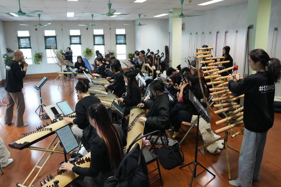Dong Quang Vinh (R, front) instructs an orchestra he found with his wife Mo Shuangshuang during a rehearsal in Hanoi, Vietnam, March 30, 2025. (Xinhua/Hu Jiali)