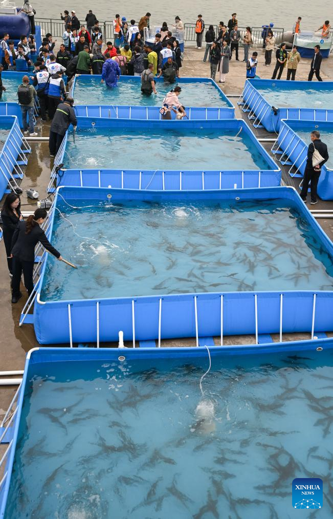 This photo taken on April 12, 2025 shows the Chinese sturgeons that are about to be released into the Yangtze River in Yichang City, central China's Hubei Province. More than 20,000 second-generation Chinese sturgeons were released into the Yangtze River during a release activity here on Saturday. (Xinhua/Du Zixuan)